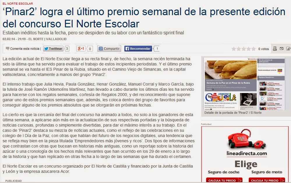 Finalmente tanto trabajo ha merecido la pena, nuestro grupo 'Pinar2' ha ganado la útima semana del Norte Escolar. Aunque no sea ganar el premio final, estamos muy orgullosos y contentos. Este tipo de cosa nos motiva para seguir trabajando con la misma energía que al principio. Veremos como se nos da el siguiente concurso...